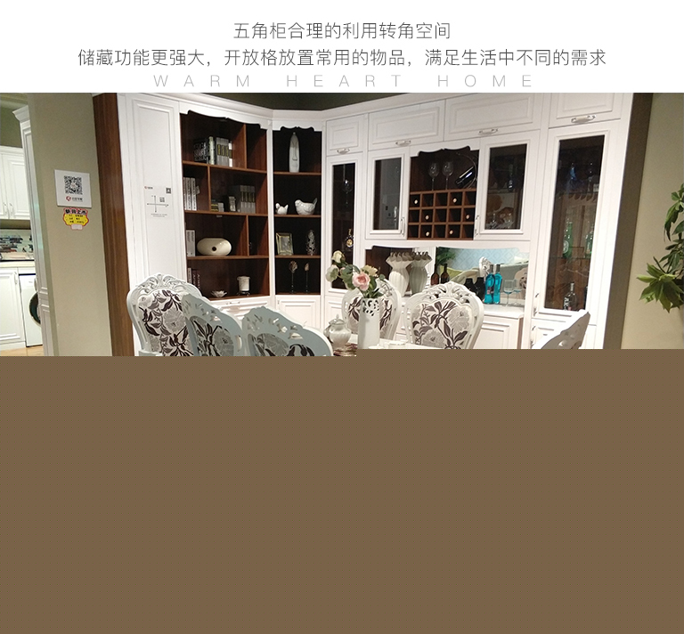 | 細(xì)節(jié)描述 | 餐邊柜在儲物的同時也兼顧了展示的作用,玻璃門板可以放置精美的餐具和收藏品,此外還特意設(shè)計了小型的圓弧臺面,方便在上面進(jìn)行簡單的備餐。五角柜合理的利用轉(zhuǎn)角空間,儲藏功能更強(qiáng)大,開放格可以放置常用的物品,滿足生活中不同的需求。 |