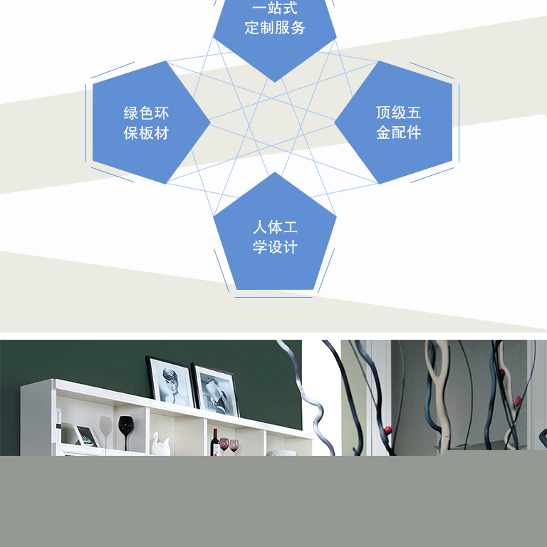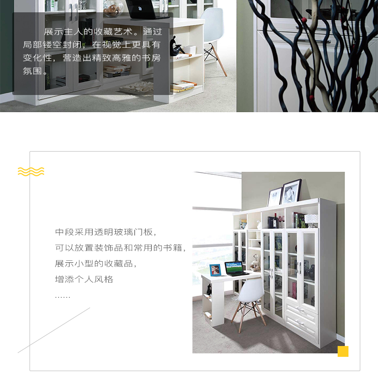 | 細(xì)節(jié)描述 | 展示主人的收藏藝術(shù)。通過局部鏤空封閉,在視覺上更具有變化性,營造出精致高雅的書房氛圍。 |
