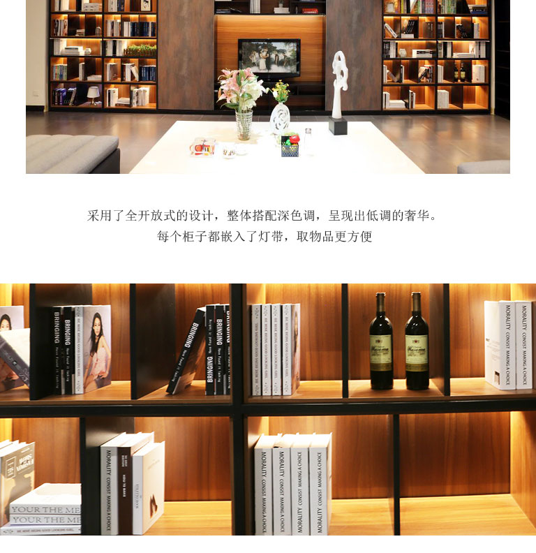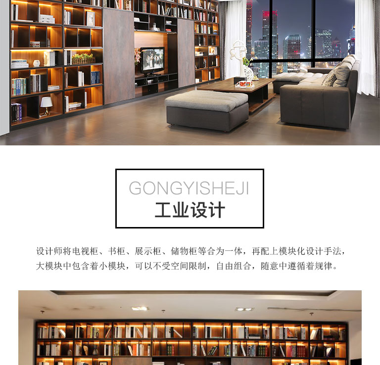 設(shè)計(jì)師將電視柜、書柜、展示柜、儲(chǔ)物柜等合為一體,再配上模塊化設(shè)計(jì)手法,大模塊中包含著小模塊,可以不受空間限制,自由組合,隨意中遵循著規(guī)律。