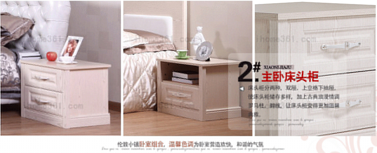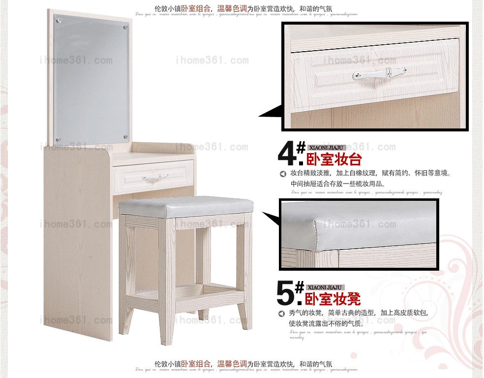 | 細節(jié)描述 | 床的床頭采用優(yōu)質珍珠粉皮,質感細膩,柔然舒服,環(huán)保不變形;床頭柜分兩種,雙屜、上空格下抽屜,使床頭柜儲存多樣;床尾柜體分區(qū)合理,配上古典懷舊的白橡紋理,更顯時尚感;妝臺精致淡雅,加上白橡紋理,賦有簡約、古典的造型;妝凳以秀氣的形象與妝臺相搭配,使他們流露出不俗的氣質;衣柜則融合了西方的古典風格和東方的現(xiàn)代神韻,儲存功能齊全、分區(qū)明確。 |