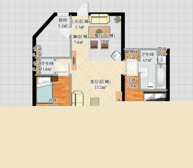 電視背景的儲物柜,滿足裝飾的功能,同時上下的半通透的處理,可以增加過道區(qū)域的變化。地面采用半啞光的地磚,具有防滑的效果。